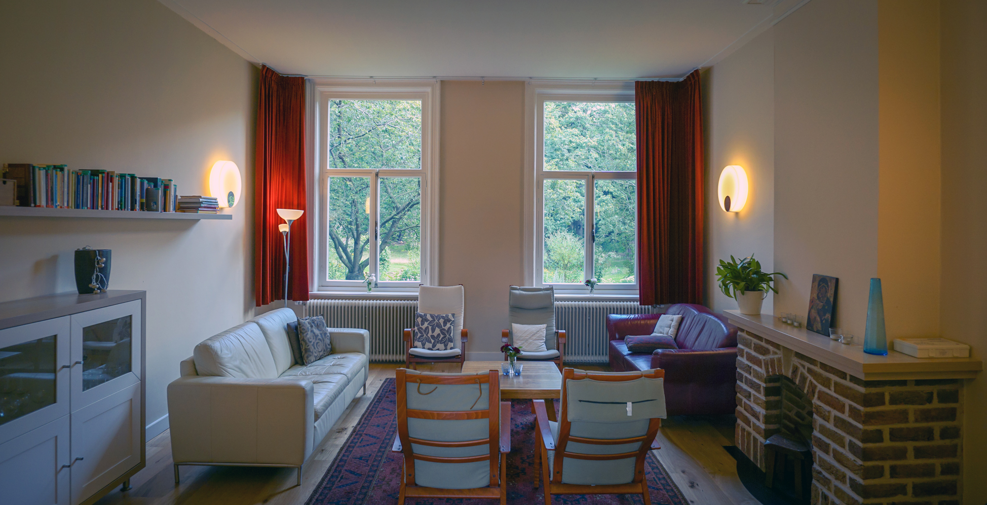 Aan de oostkant zien de kamers uit op de gastentuin, aan de westkant op de weilanden achter de abdij. De kamers, waaronder één 2-persoonskamer, beschikken over een bed, een kast, een bureau met stoel, en een wastafel. Badkamers en toiletten bevinden zich op de gang. Je kunt tijdens je verblijf gratis gebruik maken van WiFi. Op de begane grond bevindt zich een woonkamer en keuken. Ingrediënten voor koffie/thee tijdens je verblijf zijn inbegrepen. Het ontbijt wordt elke ochtend geserveerd in onze koffieschenkerij.